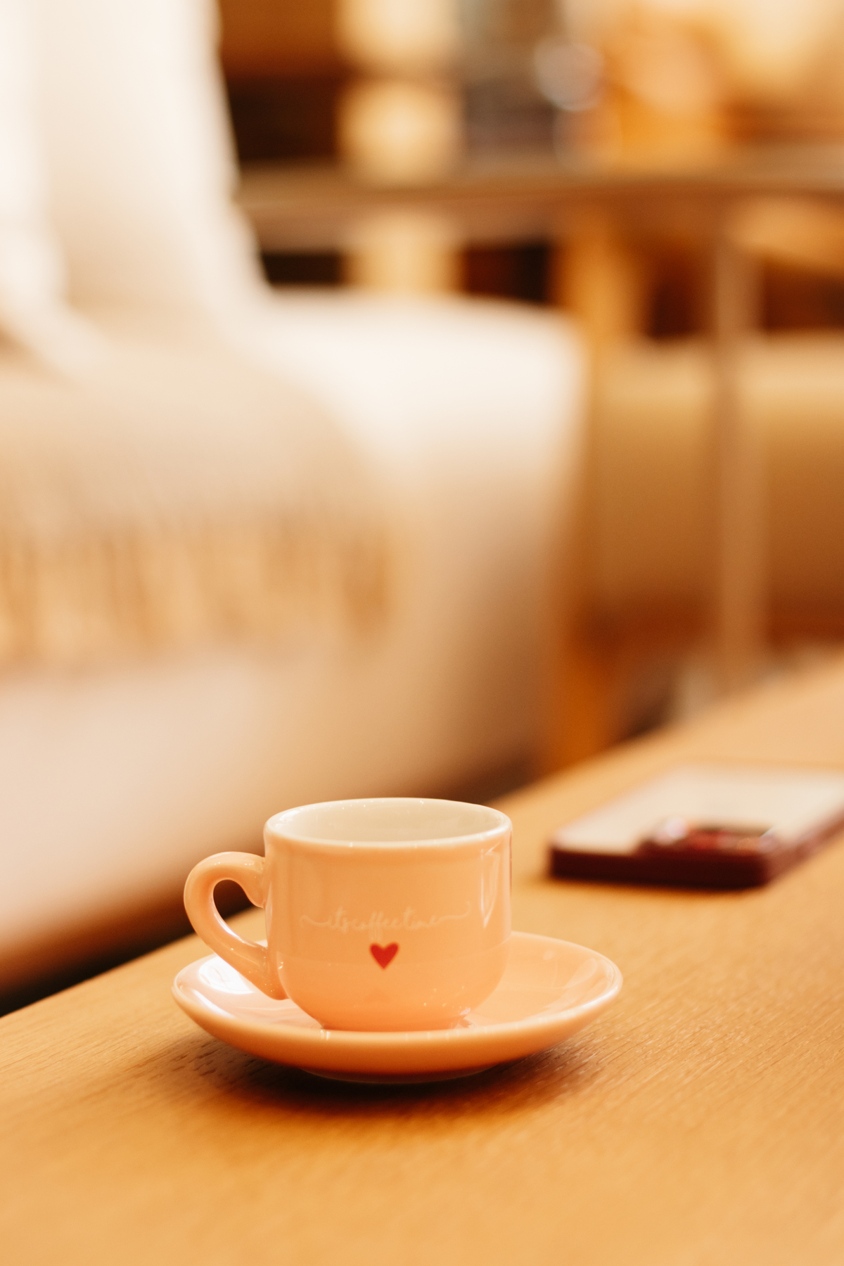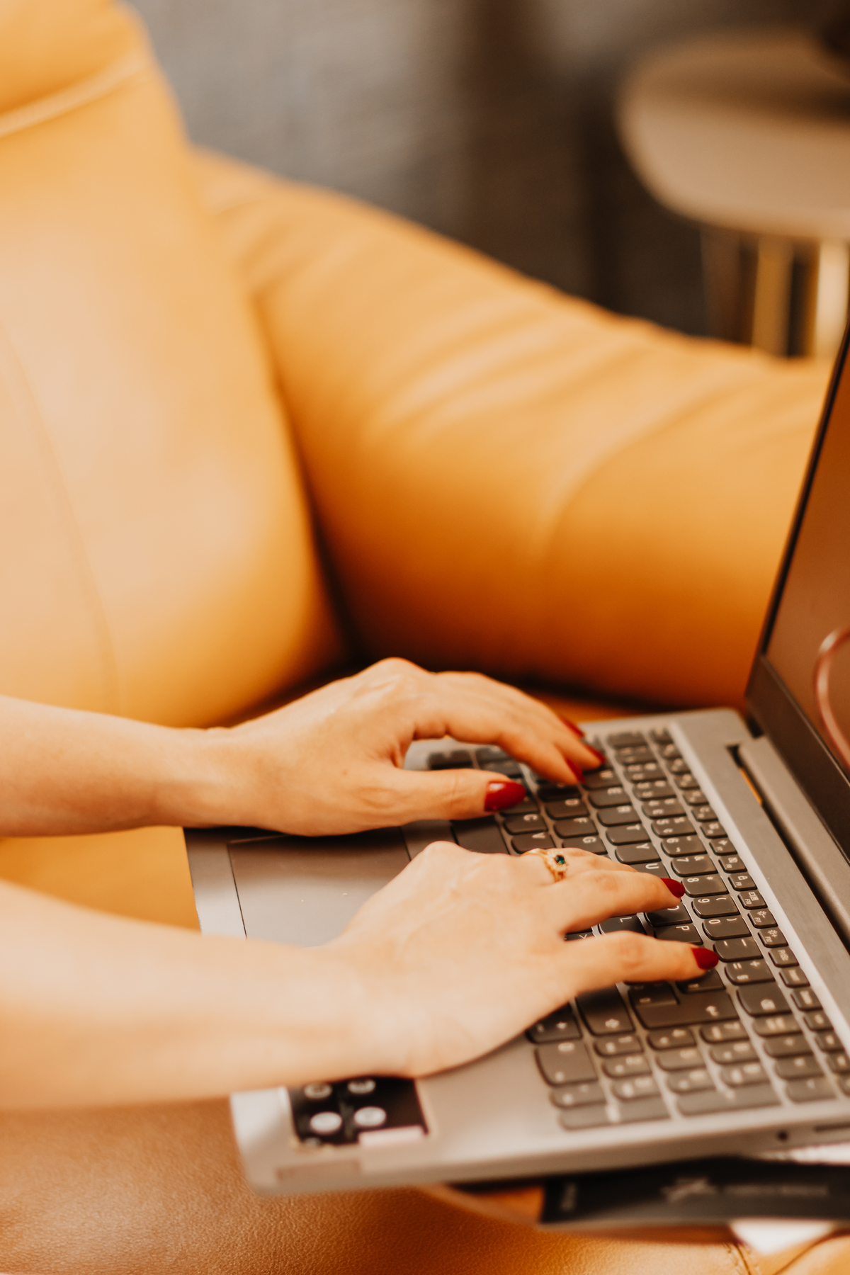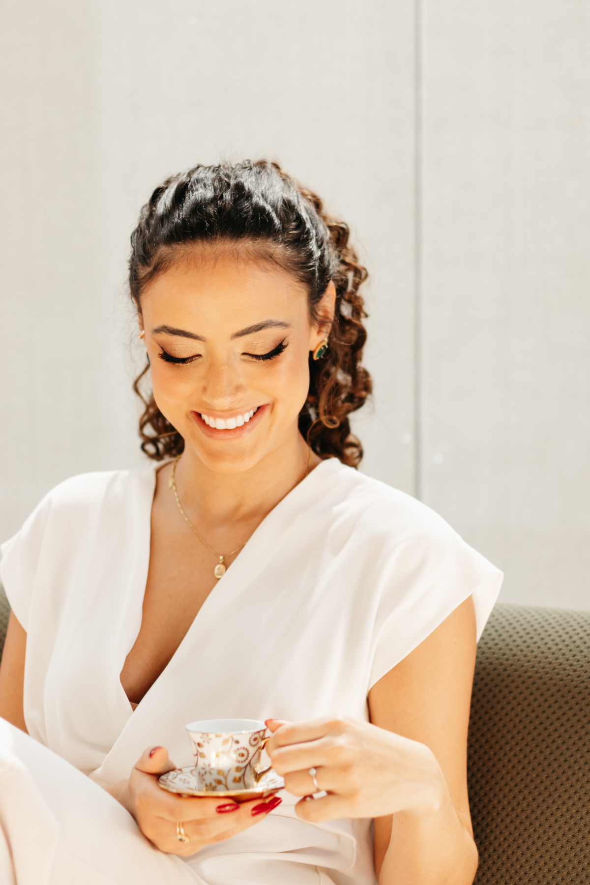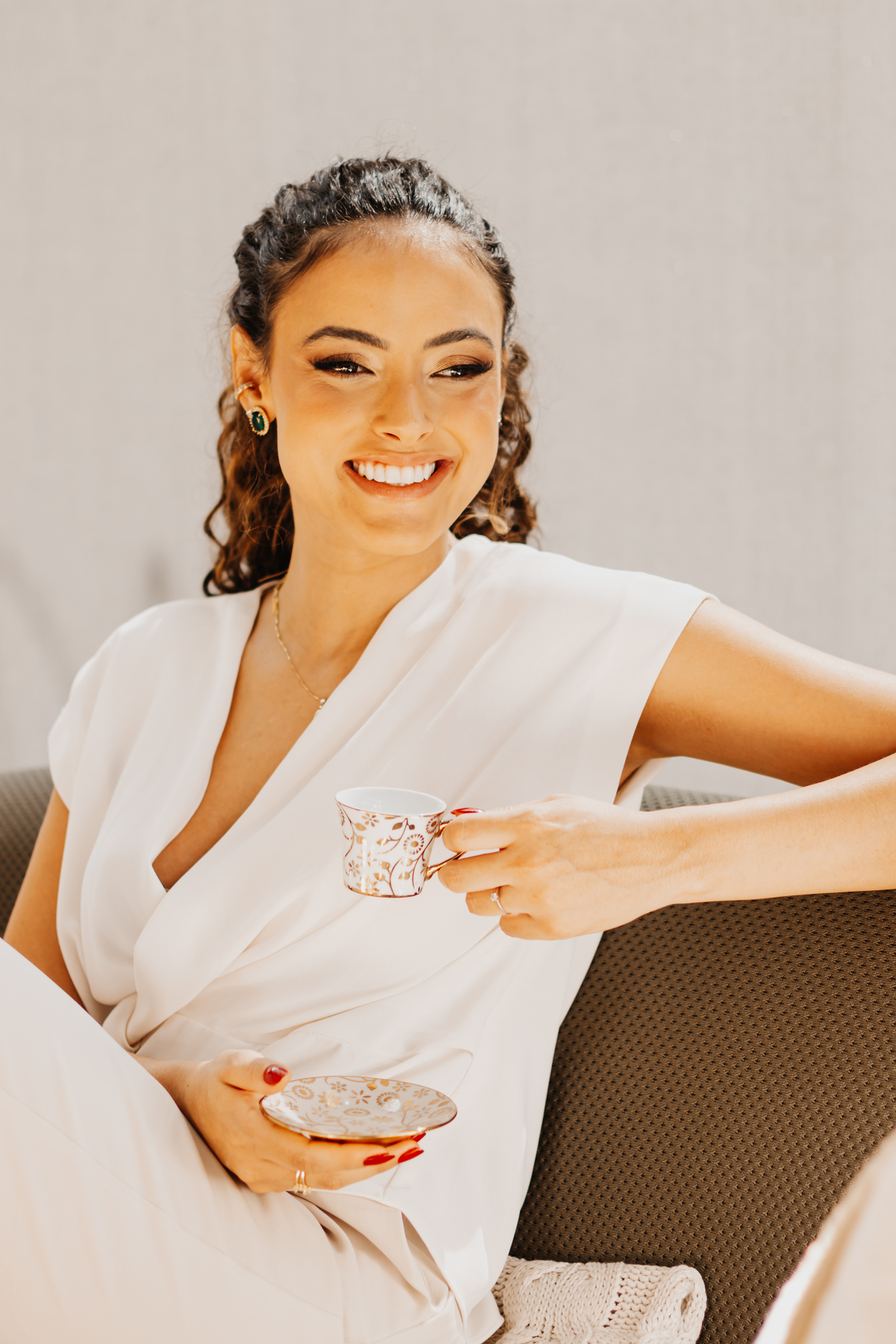 Utilizamos elementos como xícara de chá, notebook e celular que fazem parte de sua rotina e narrativa.